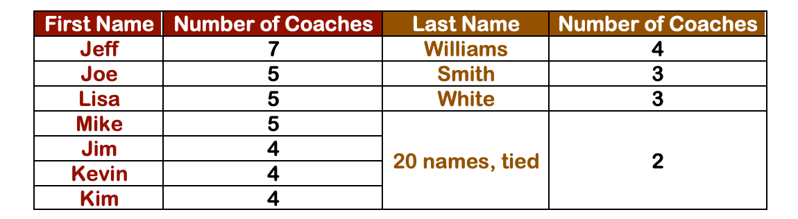Sixteen coaches have hyphenated last names, and 12 have a last name beginning with “Mc,” compared to just two “O’____” names.
