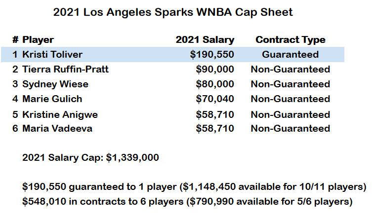 The Sparks have so many unknowns heading into this offseason that it's tricky to even try to do the math. Hypothetically, let's say they cut Marie Gulich (who didn't play much this year) and Tierra Ruffin-Pratt (who became expendable due to the play of Brittney Sykes). They'd then have $951,030 of cap space for seven or eight spots.