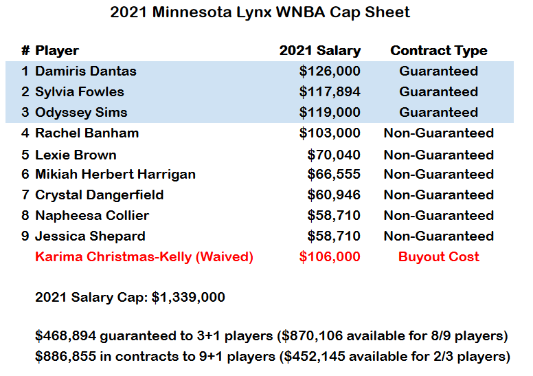 Minnesota is the only team already carrying “dead money” into 2021, due to waiving Karima Christmas-Kelly’s guaranteed deal during the 2020 season, but is in pretty good cap shape regardless. With starters such as Collier and Dangerfield still on rookie-scale contracts and key veterans like Fowles and Dantas on manageable deals that originated under the old CBA, the Lynx are in position to go shopping this offseason.