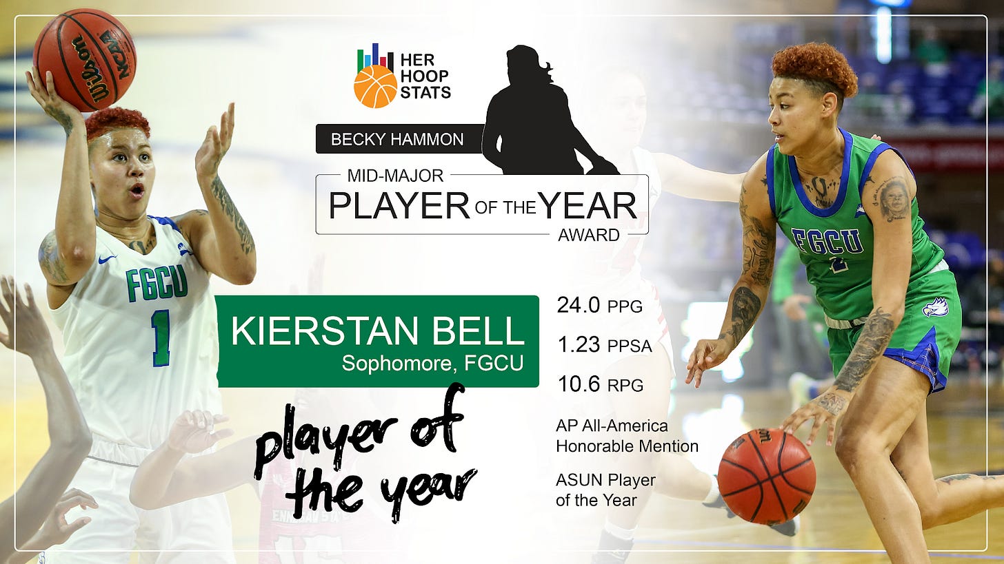HOPEWELL, N.J. (March 31, 2021) — Her Hoop Stats is proud to announce that FGCU sophomore guard Kierstan Bell has been named the 2021 Becky Hammon Mid-Major Player of the Year presented by Her Hoop Stats. The award, which is in its second season, recognizes the best mid-major player in the country.