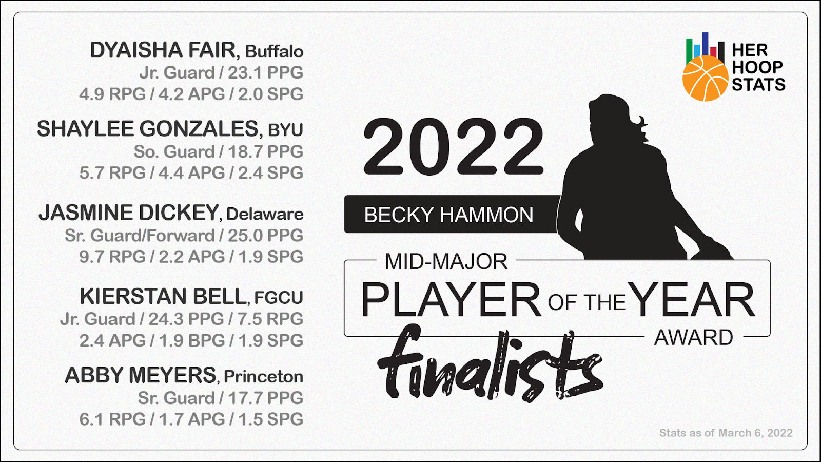 2022 Becky Hammon Mid-Major Player of the Year presented by Her Hoop Stats Finalists
