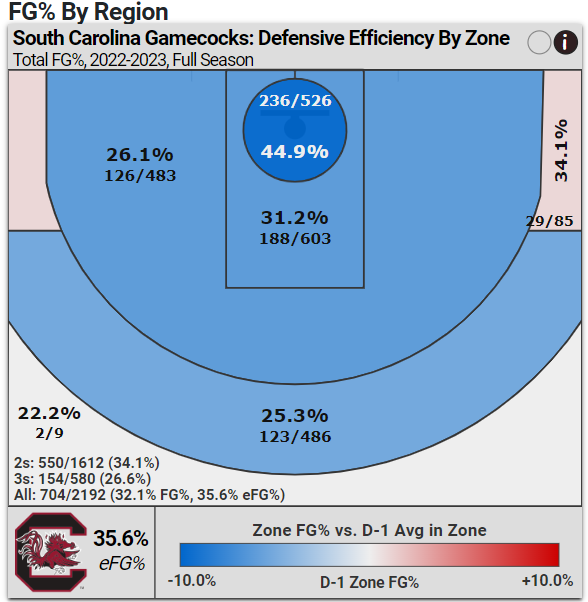 But why was South Carolina such a heavy pre-tournament favorite? Of course, the Gamecocks entered the tournament at 32-0 with victories over Stanford, UCLA, Tennessee (twice), UConn, and a blowout win over LSU. Digging a bit deeper, it was South Carolina’s defense, specifically its interior defense, that powered the Gamecocks to such an impressive run.