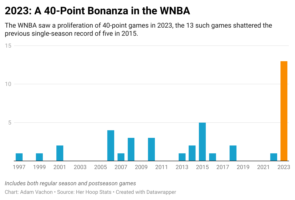 And also, what’s the deal with all the 40-point games in the W? No, that’s not intended to be the beginning of a bad Jerry Seinfeld-esque joke; it’s a serious question. The league saw 13 such performances in 2023, shattering the previous high of five games in 2015. Maybe it’s that offensive efficiency and pace have increased in recent seasons, creating an ideal environment for such special performances. Perhaps it’s that the W saw more high-volume shooting nights than ever before – an average of 2.11 players in each 2023 regular-season game attempted at least 15 field goals, 15% more than the previous high of 1.83 in 2021. It could be a combination or neither of these. After all, 40-point games are low-frequency events, so maybe it’s just random chance we saw so many this season.