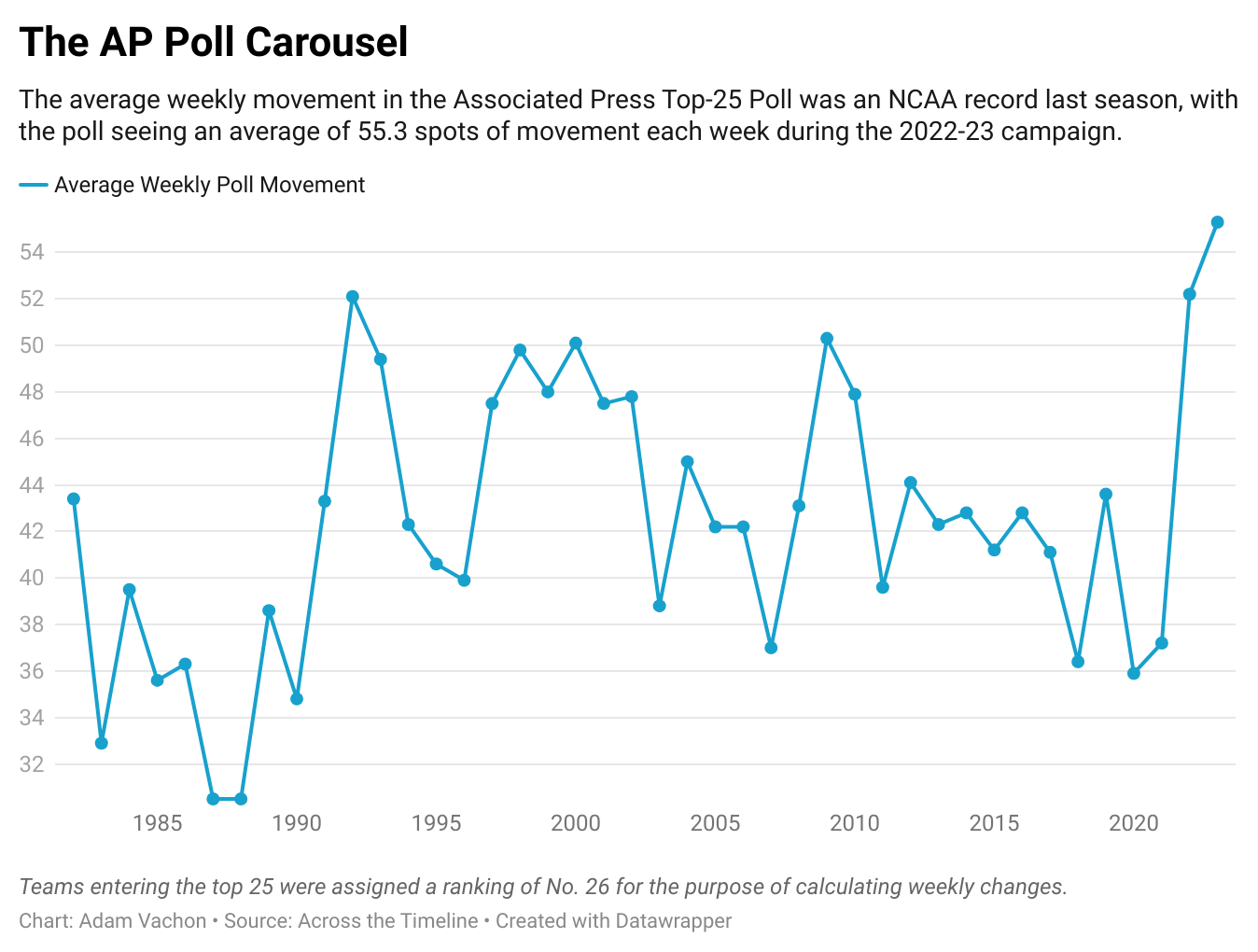 55.3 – Average weekly movement in the AP poll