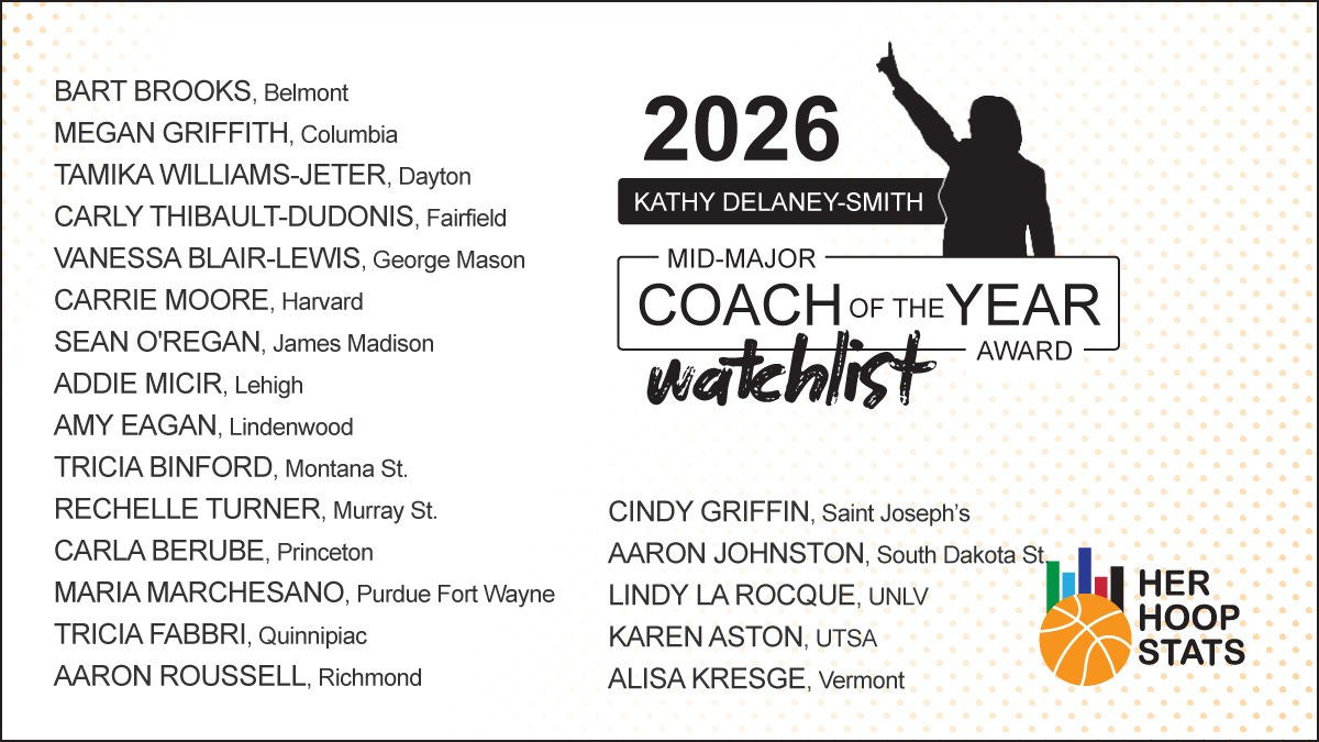 HOPEWELL, N.J. (October 29, 2025) — We are proud to announce the 20-person watch list for the 2026 Kathy Delaney-Smith Mid-Major Coach of the Year Award presented by Her Hoop Stats. This is the third season of the award, named after the legendary former Harvard head coach. Richmond’s Aaron Roussell was named the award’s second winner in 2025. This year’s watch list includes coaches from 13 conferences.