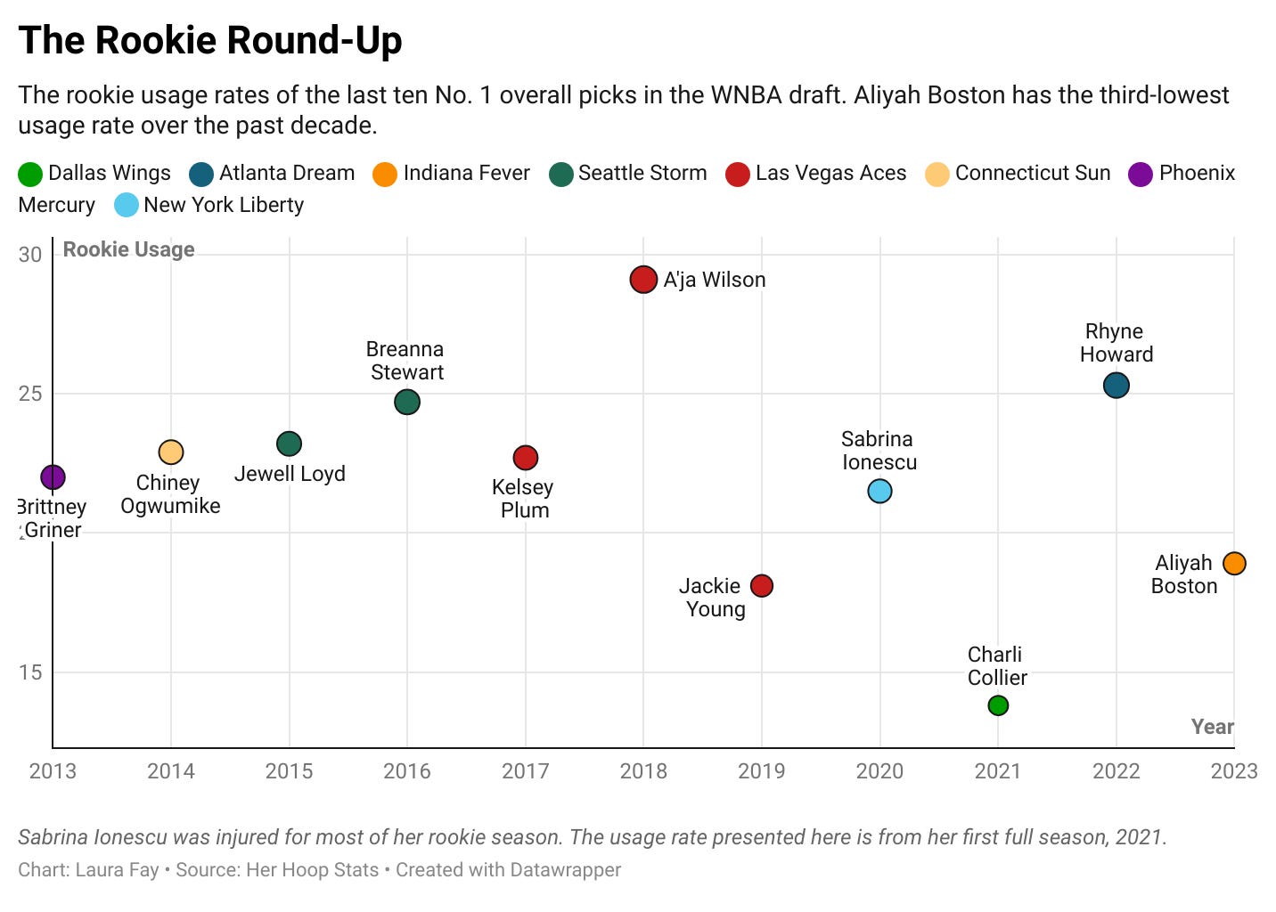 For context, the base usage should everything be even across a starting five is 20%. Across Indiana’s preferred starters, Boston’s usage is higher than only the defensive-minded Lexie Hull. In fact, Kristy Wallace has a higher mark (19) coming off the bench. This is also anomalous when looking at rookies as a whole. Of the last 10 No.1 overall picks, only two—Jackie Young (2019) and Charli Collier (2021) —had lower usage rates in their rookie year. Neither was as efficient or productive as Boston has been so far.