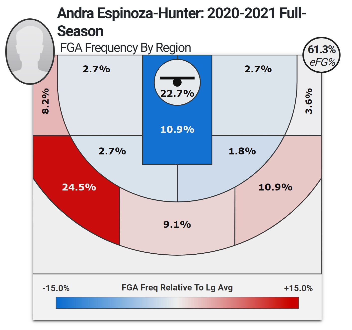 According to CBB Analytics, almost a quarter of her field goal attempts come from the left wing. League-average at that spot on the court is 9.3%. Essentially, what we see is a player extremely comfortable with that area, and Andra is downright deadly when she gets to her spot.