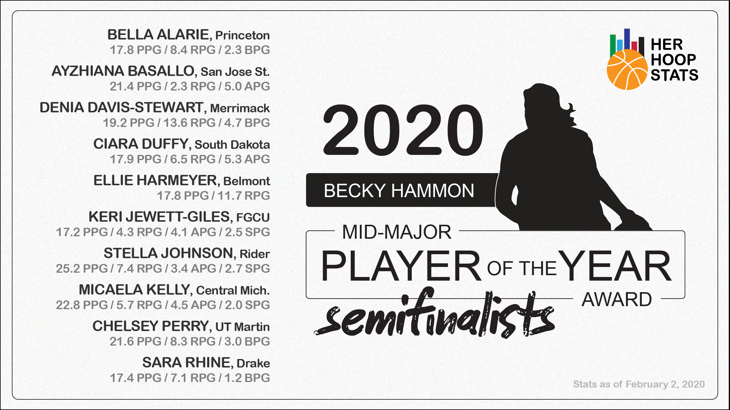 HOPEWELL, N.J.—Her Hoop Stats is proud to announce the 10 semifinalists for the inaugural Becky Hammon Mid-Major Player of the Year Award. The Becky Hammon Award presented by Her Hoop Stats recognizes the nation’s best mid-major player, the first such award in women’s college basketball.