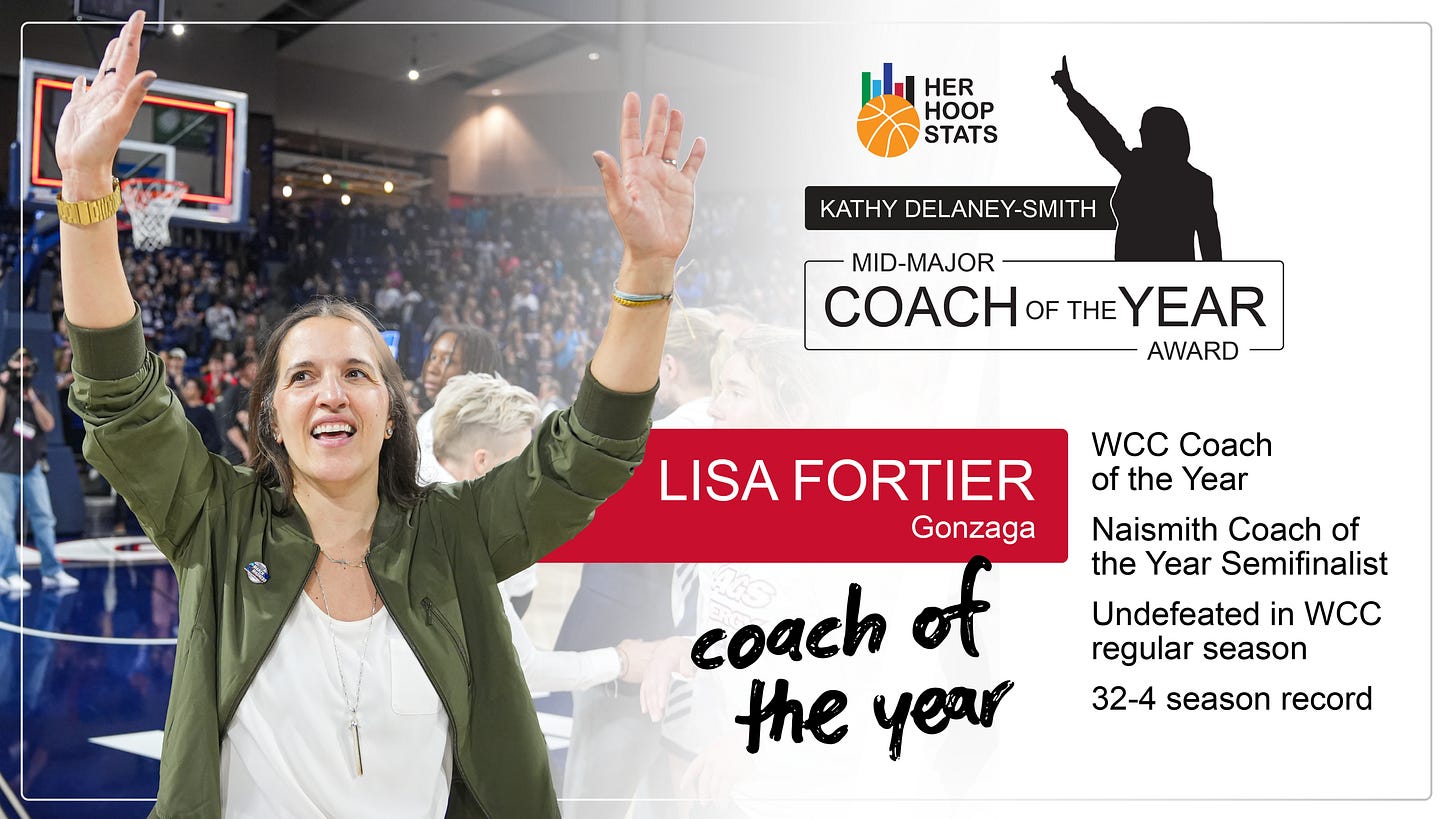 HOPEWELL, N.J. (April 3, 2024) — Her Hoop Stats is proud to announce that Gonzaga head coach Lisa Fortier has been named the 2024 Kathy Delaney-Smith Mid-Major Coach of the Year presented by Her Hoop Stats. The award, which is in its first season, recognizes the most outstanding mid-major head coach in the country.