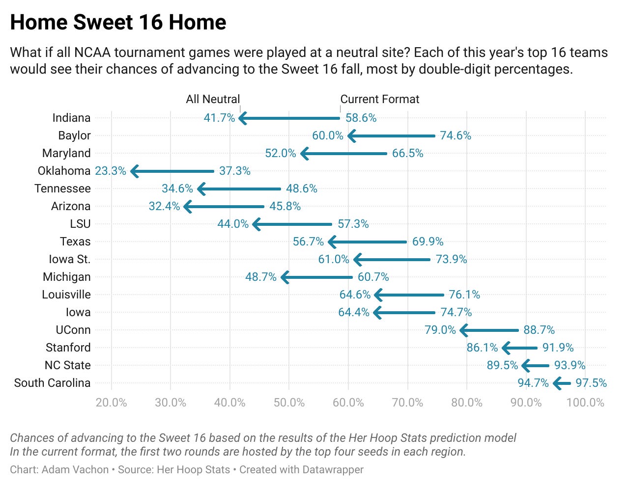 But what if this season the NCAA had adopted a tournament format where all games occurred at neutral sites, akin to the men’s model? The Her Hoop Stats prediction model enables us to explore that hypothetical. In particular, let’s take a look at the top 16 teams and the impact such a change would have on their prospects of advancing to the Sweet 16.