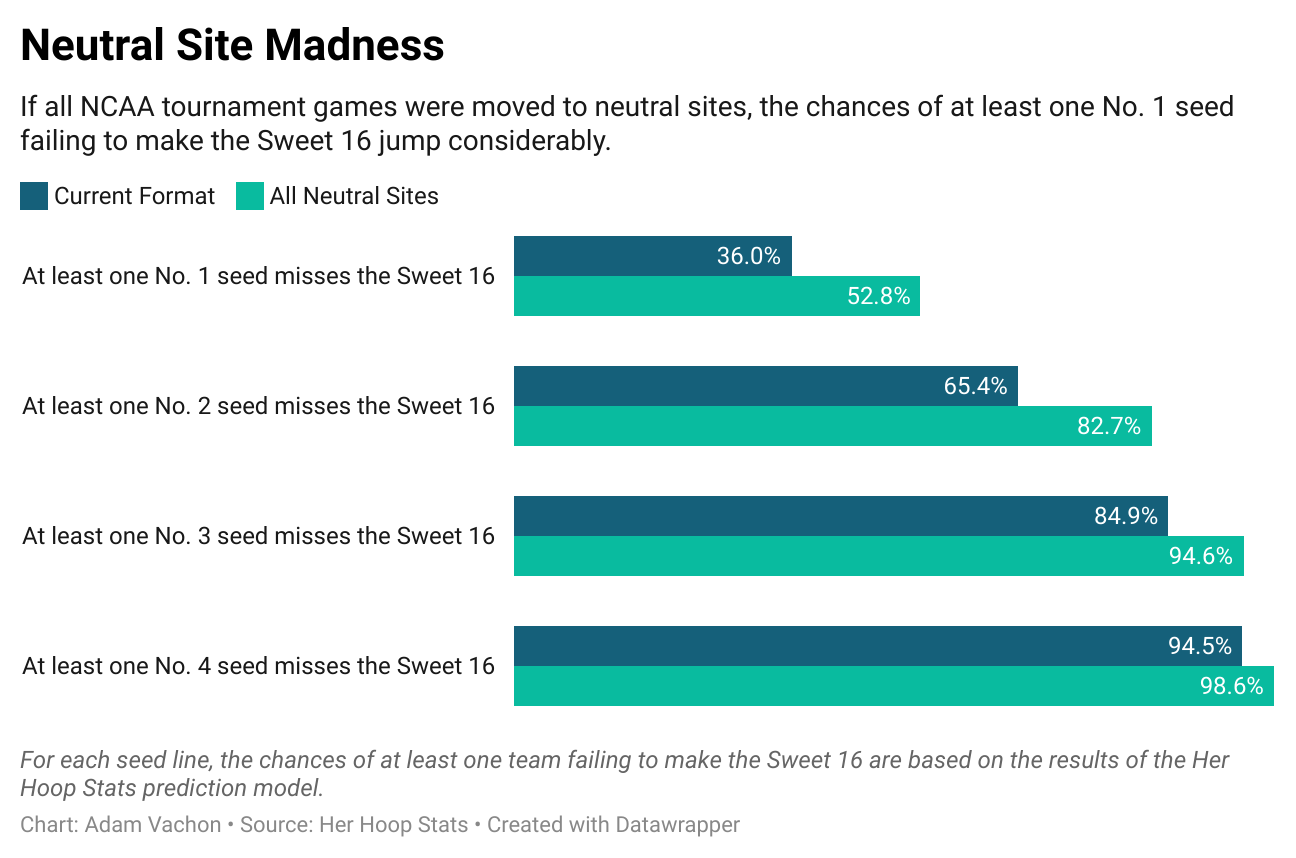 In short, the road to the Sweet 16 would be much tougher for this year’s top 16. The majority of these teams would see their chances of reaching the regional semifinal plummet by double-digit percentages. Another way to conceptualize this is to look at the chances that at least one team within a given top-four seed line loses in the first two rounds. The Her Hoop Stats prediction model gives a 36% chance to at least one No. 1 seed falling in the first two rounds, driven largely by Louisville having just a 76% chance of making the regional semifinals (the other No. 1 seeds each have at least a 90% chance). Switch all games to neutral sites and the chances of at least one No. 1 seed failing to qualify for the Sweet 16 jump to slightly better than a coin flip.