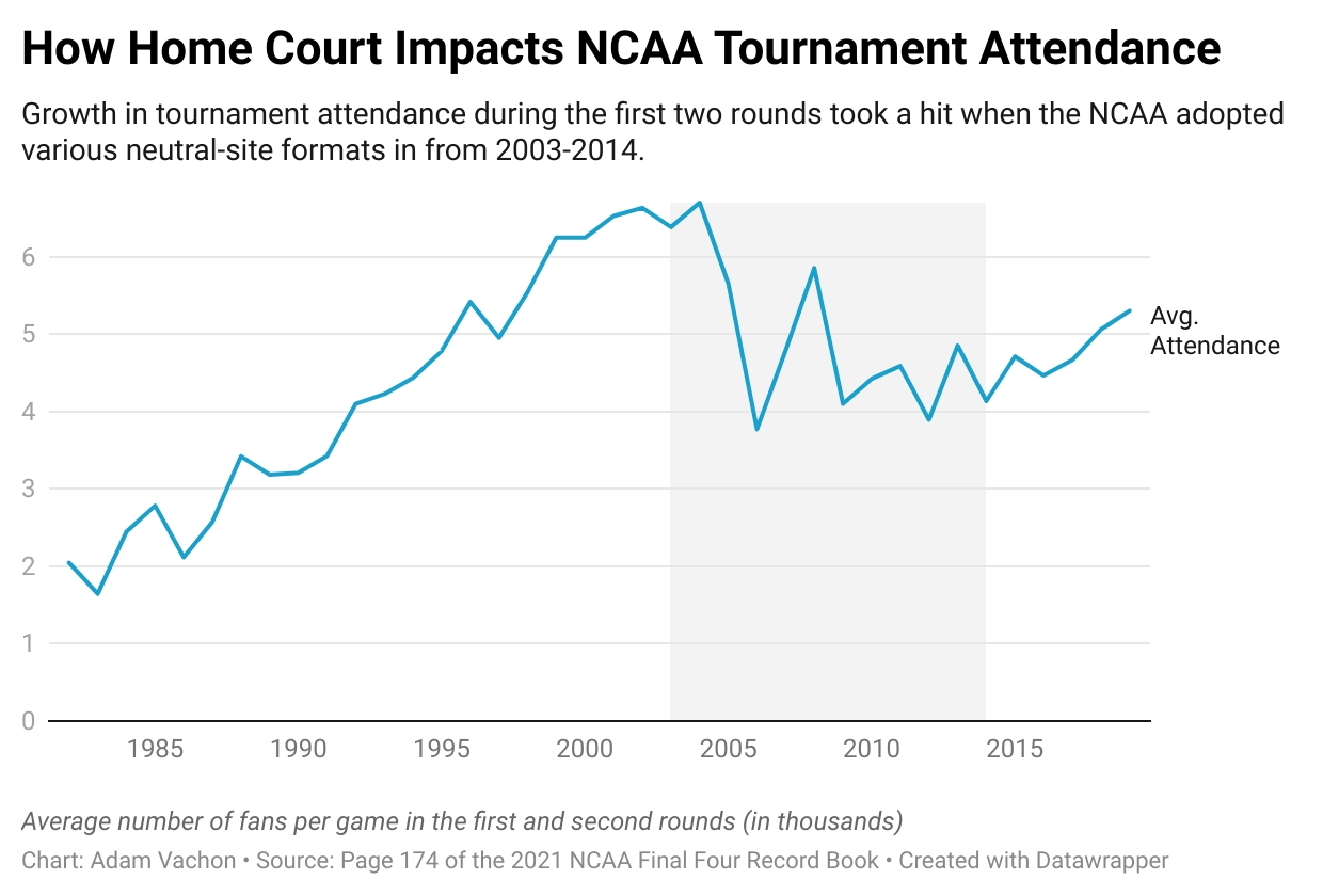 The topic of moving to a pure neutral site format arose during press conferences at last year’s tournament (which itself took place at neutral sites due to the pandemic). Some coaches explained why such a move would be counterproductive to the primary goal of drawing fan support.