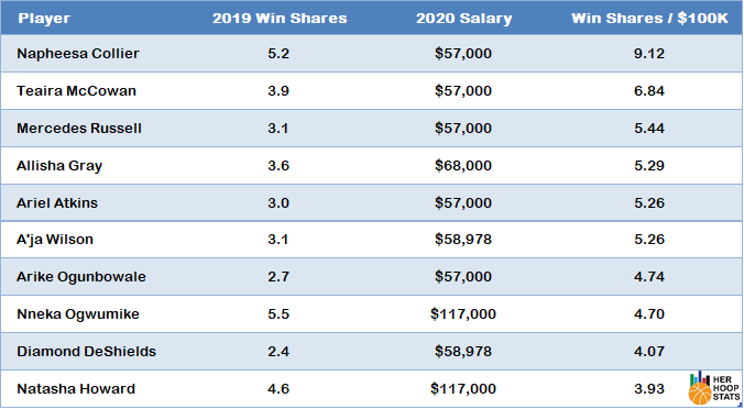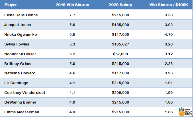 The biggest bargain of all is Napheesa Collier who will earn just $57,000 on her rookie deal for 2020 after it was adjusted up to the minimum salary by the new CBA rules. The reigning Rookie of the Year totaled 5.2 Win Shares for the Lynx in 2019. Just how much of a bargain is Collier? Well, using those values she delivers 9.12 Win Shares per $100,000 of salary. That is a league-high by over two Win Shares per $100,000.