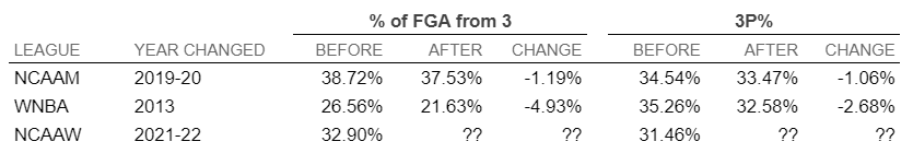 To answer these questions, we first asked what data is available to us to inform our calculation. As we said above, NCAA Division I Men’s Basketball underwent the same change two years ago. The WNBA extended their line to the current distance for the 2013 season. We can learn from what happened in those leagues to form our expectations for next year.