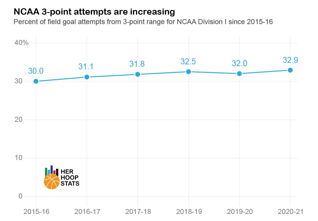 There’s no question that three-pointers have become a bigger part of the women’s game each year. From 2015-16 to last season, the percentage of shots that were from behind the arc has increased from 30.0% to 32.9% for NCAA Division I women. That’s a 2.9% difference on an absolute basis and a 9.7% increase over the past six seasons.