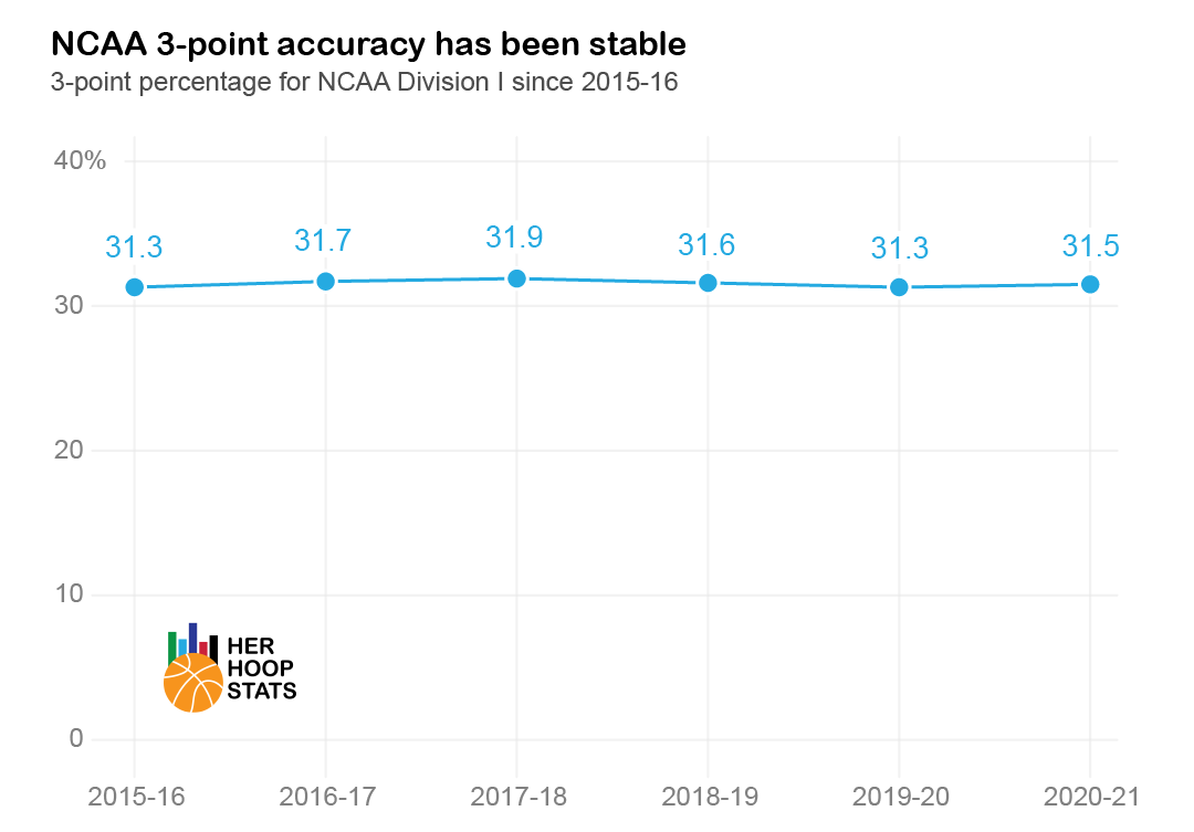 While the number of three-point attempts has increased over time, the accuracy has been relatively stable. On the whole, women have averaged anywhere from 31.3% to 31.9% over that period, a relatively tight range. Last season, Division I players made 31.5% of their threes.