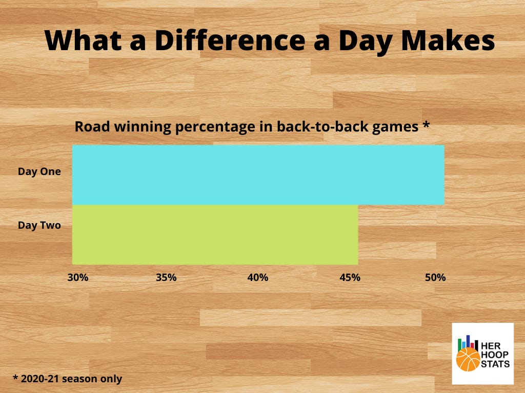 Both of these measures do give credence to the idea that players are more fatigued after playing the previous day. Average pace slows down by over a full possession on day two, dropping from 70.6 to 69.4. Despite that slower pace, total fouls per game increase from 33.7 to 35.0. (Hoop Vision’s Jordan Sperber found that these trends exist on the men’s side as well.) The cliché about depth being more important in a tournament setting may be more than just a cliché.