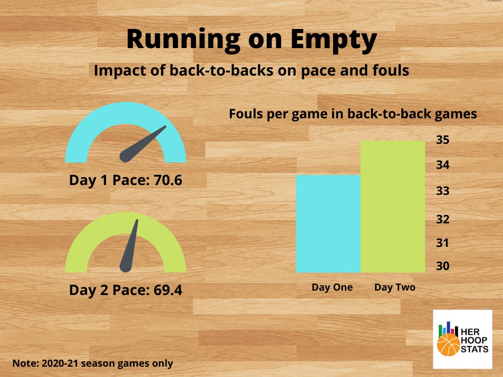 Another common theme among broadcasters and coaches alike this season is fatigue. It makes sense that 80 minutes of basketball in 24 hours would lead to some tired legs. There are a couple of ways we can measure how tired teams are on day two of back-to-backs: pace and fouls. Tired teams play slower, and tired defenders foul more.