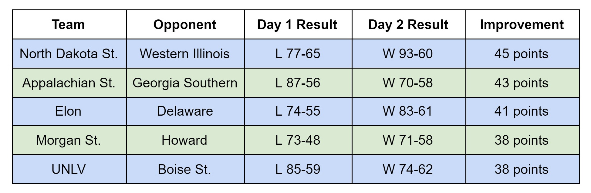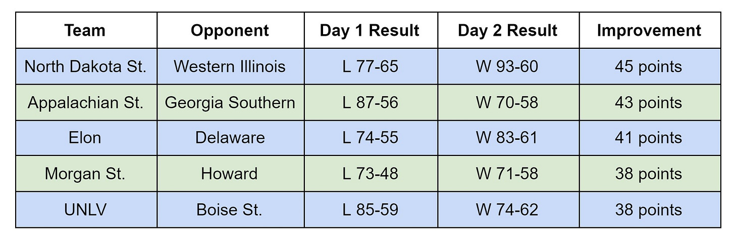 With a few small exceptions, both games of a back-to-back are basically played under the same circumstances, which means huge turnarounds can almost entirely be chalked up to the sheer unpredictable nature of the sport. Then again, that may be doing a disservice to the ability of some coaches to make impressively quick adjustments. Let’s take a look at which teams have changed their fortunes the most from day one to day two. (Extra shout out to Appalachian State, who beat Georgia Southern the day after losing by 31!)