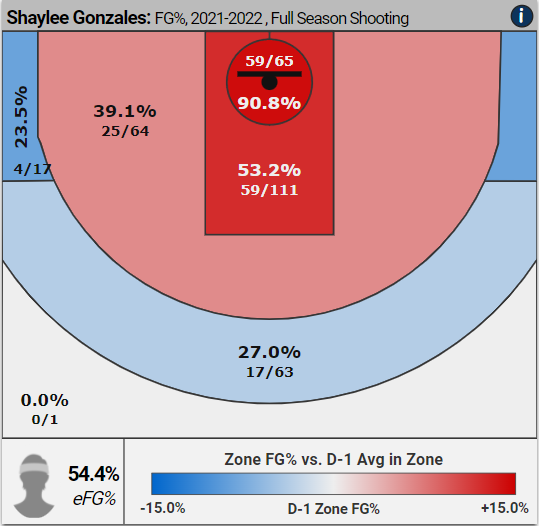 BYU boasts the country’s top-ranked mid-major program (per the most recent AP poll, Her Hoop Stats rating, and CollegeInsider.com’s mid-major rankings) and one of the best offenses in Division I; Gonzales is the primary reason why. Her ability to penetrate and create opportunities for herself and her teammates is unmatched in the WCC. She leads the conference in assists with 5.6 dimes per contest during WCC games. She ranks second in the WCC with 18.4 points per conference game, chiefly because she finishes at the rim better than almost anyone in the country. Her 90.8% field goal percentage on attempts within four feet this season is significantly higher than the Division I average of 59.1%. Only one WCC player since the 2009-10 season has averaged at least 15 points, five assists, and five rebounds in conference play; Gonzales is on pace to become the second. All of this adds up to Gonzales having the eighth-most win shares in the country.