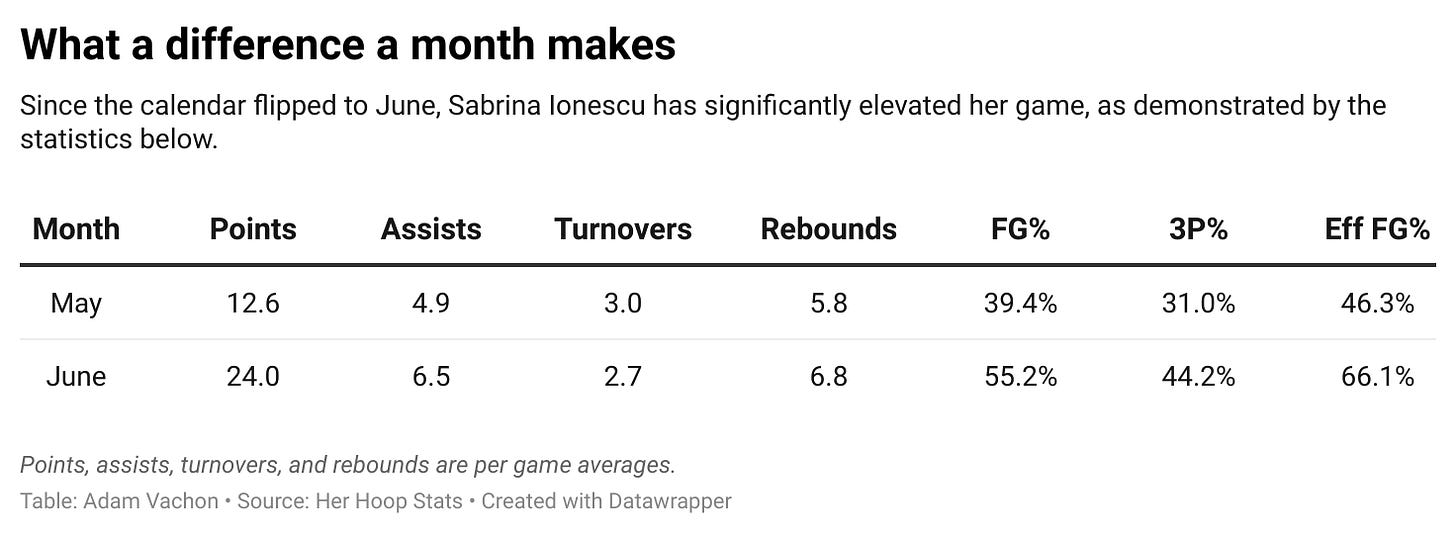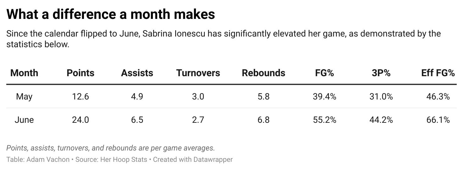 Last week was impressive, but it was simply a continuation of Ionescu’s outstanding play in June. Her passing, rebounding, and shooting have all dramatically improved this month. Most notably, after averaging just 12.6 points per game in May, Ionescu is dropping nearly double that total per night in June.