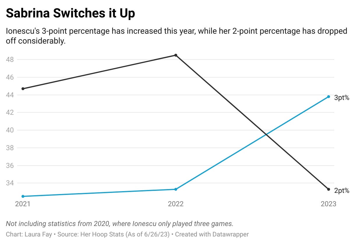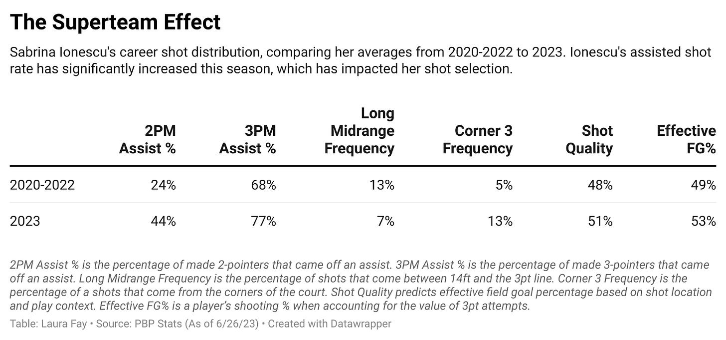 Ionescu’s 3-point prowess is likely in part due to playing alongside a pass-first point guard. Three-point shots are more frequently assisted than twos, and assisted threes are some of the highest percentage shots in basketball. While Ionescu created more of her own 3-point looks in past years, having someone like Vandersloot beside her can spread the floor and open Ionescu up for easier shots from deep.