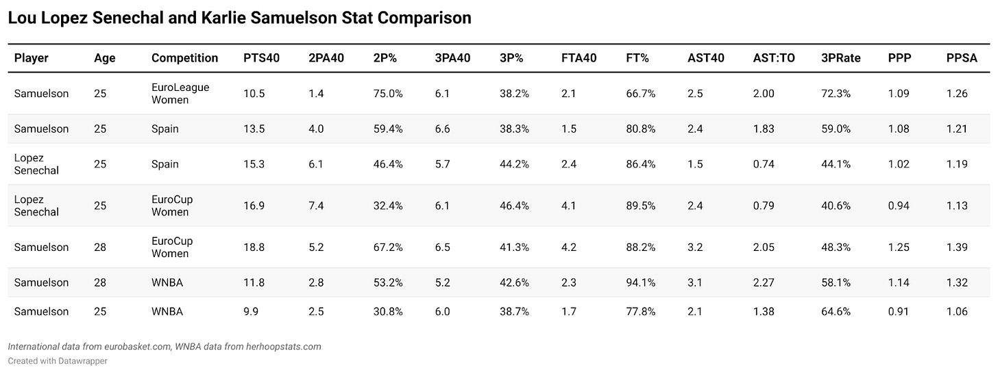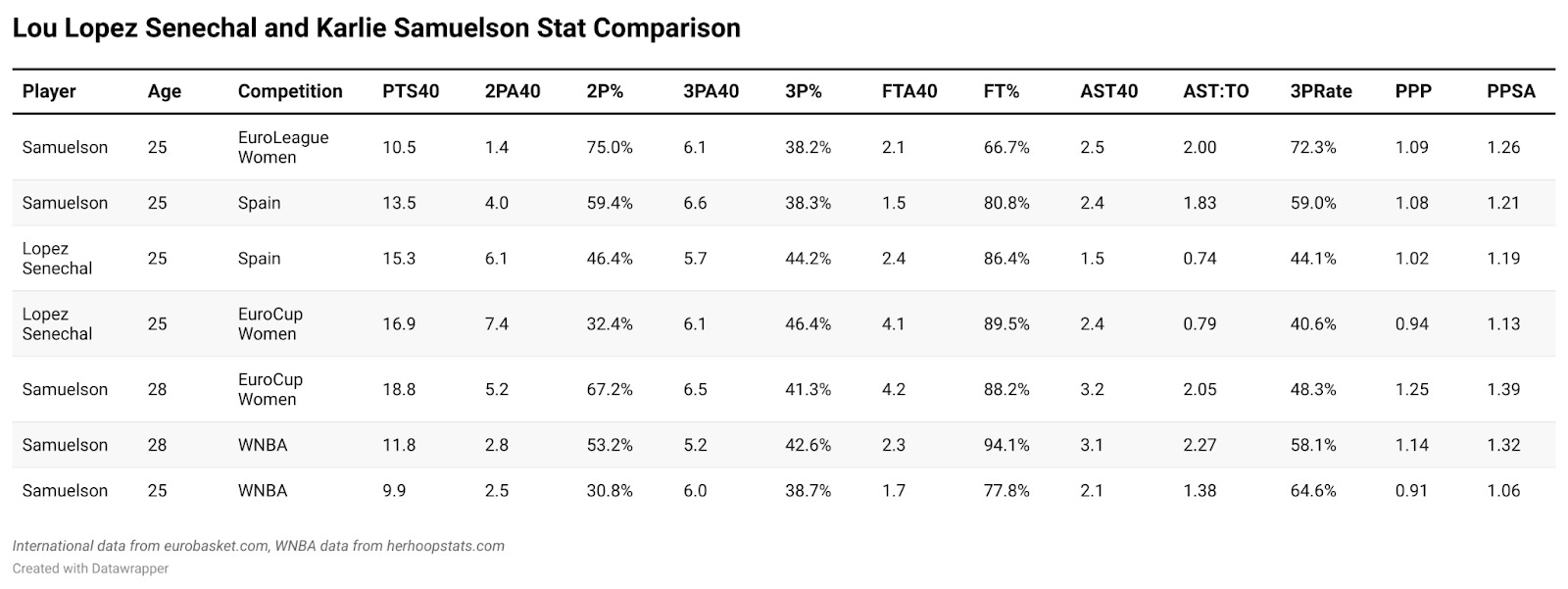 Karlie Samuelson might represent a compelling point of reference for Lopez Sénéchal’s continued role as a professional, not just in the WNBA but in overseas competition as well. Also an extremely accurate shooter, Samuelson had a much more circuitous path to the WNBA, going undrafted and not playing at least 100 minutes in a WNBA season until 2021, the fifth season that she was eligible to play in the league. However, because of the differences in their career paths, Samuelson was actually the same age in 2021 that Lopez Sénéchal is now, and she actually spent her 2020-21 international season also playing in the Spanish league. Consequently, there can be some valuable information gleaned from comparing the two players statistically. (Only the specific subsets of competitions that are the most comparable are included below because of the stark differences in quality between different competitions, even ones that involve the same teams.)