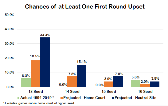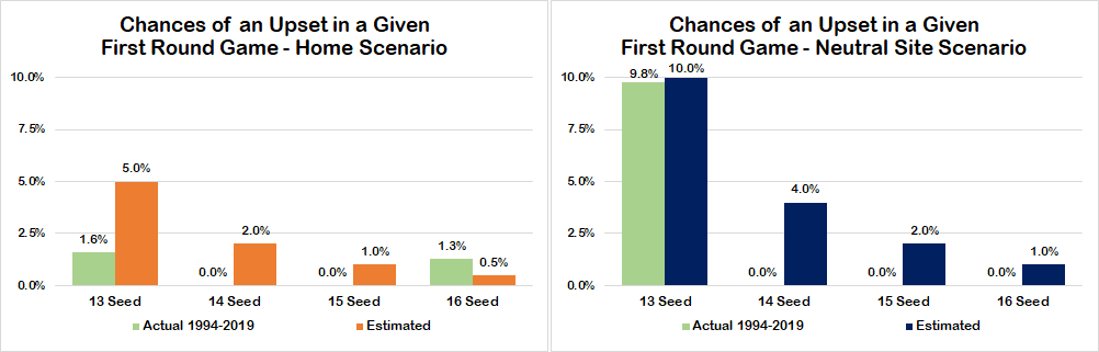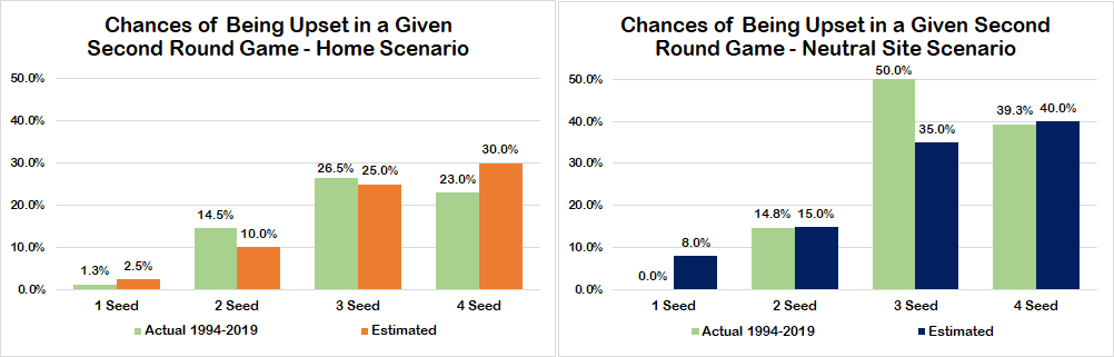 Here's a look at how often upsets have happened historically in the first and second rounds of the tournament. Even going back to 1994, this is still a limited sample. So for the purposes of this analysis, I am assuming a plausible distribution of the probabilities both at home and on neutral sites for each of the first two rounds. These estimates aren't perfect, but they are certainly in the ballpark and give a sense of what the approximate results are.