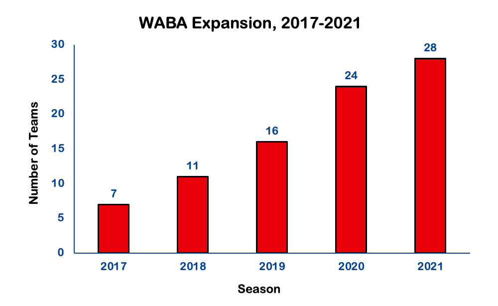 Driven by its mission to provide more opportunities for female players, the WABA has quadrupled in size over the past few years, from seven teams in its inaugural season in 2017 to 28 as of November 2020. (Expansion is still open for the 2021 season.) Yet there is still a waiting list of people who would like to own a WABA franchise, as Blount wants to ensure that all new teams have enough nearby opponents to build out a strong regional schedule.