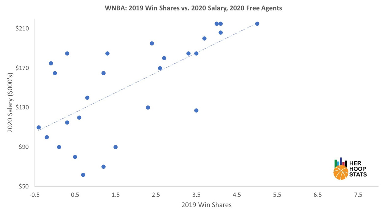 Based on this analysis, WNBA teams spent approximately $20,000 per incremental Win Share on free agents in 2020. Of course, this data is just an approximation of the financial worth of a Win Share and teams consider many factors beyond just Win Shares when negotiating contracts. There’s a pretty clear trend between the 2019 Win Shares data and 2020 salaries for free agents as shown below. The R-squared of the trend line is 0.45, meaning that approximately 45 percent of the variance in salary is explained by the win shares. On the trend line, salary increases by $20,164 per win share with an offset of $115,055 for zero Win Shares.