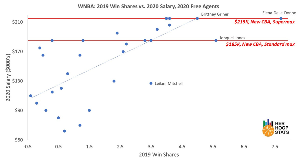 Two players who would otherwise qualify are excluded from the analysis because they are outliers (in the best possible way!). Washington’s Elena Delle Donne and Connecticut’s Jonquel Jones were the top two players in Win Shares in the league in 2019 with 7.7 and 5.6 Win Shares respectively. Both signed the new maximum contracts available to them including a supermax for Delle Donne, but are still limited to far below their worth on a completely free market. Adding Delle Donne and Jones back in with the $20,000 trend line and also noting the league maximum salaries specified in the CBA, we see: