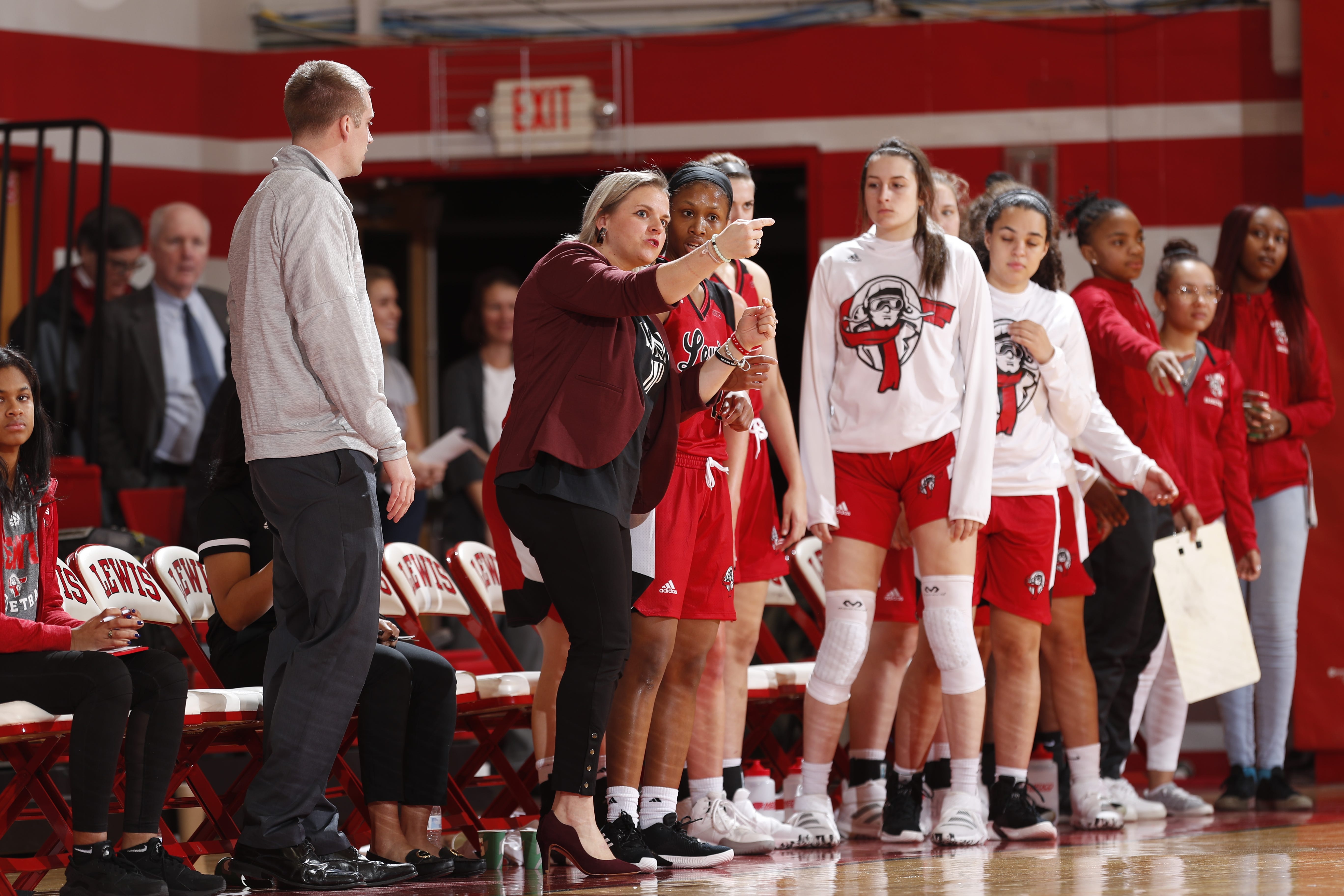 Lewis University head coach Sam Quigley Smith watches the action during a game. Photo credit: Steve Woltmann