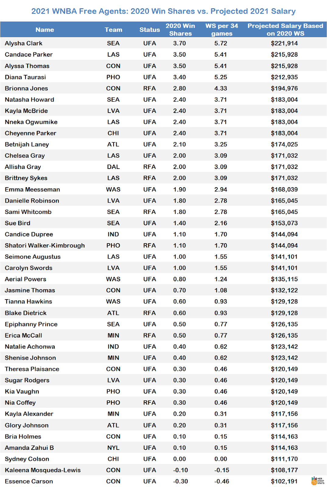 Earlier this summer, we took a look at the new CBA and what the WNBA paid for free agents in the 2020 season. Based on our analysis, free agents earned approximately $20,000 in additional salary per additional Win Share (based on 2019 performance).