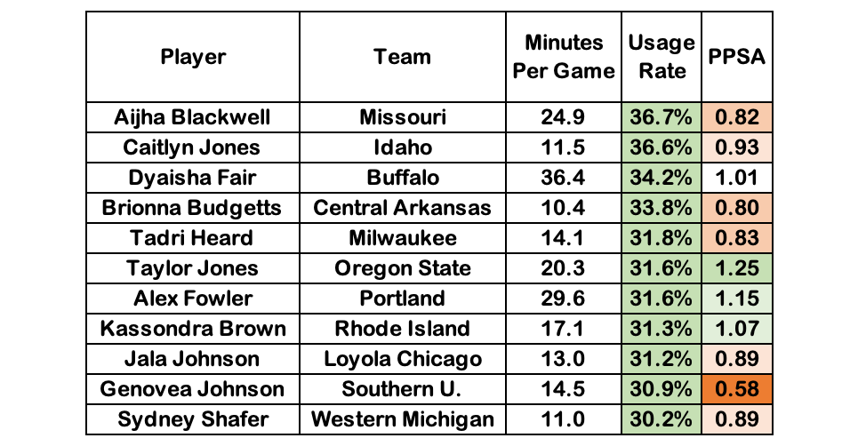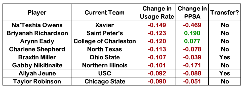 It is also noteworthy that two of the three players with the largest decreases in usage this season have increased their efficiency. Of that trio, College of Charleston’s Arynn Eady has the highest PPSA this season, 1.06, but her usage rate of 13.6% is below average. And Saint Peter’s Briyanah Richardson has gone from a below-average 0.82 PPSA last season to an above-average 1.01 this season as her usage dropped from the 98th percentile to about average.