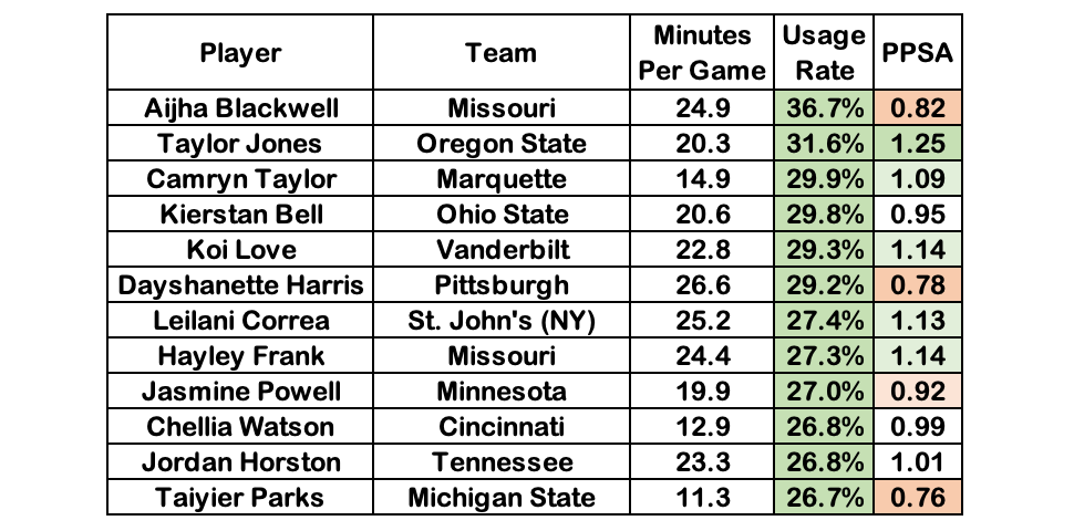 There are also players like Arizona State’s Ja’Tavia Tapley (formerly at USC) and Texas Southern’s Ciani Cryor (Rutgers) who gained larger roles after transferring to a new school. Both players have managed to maintain their above-average efficiency despite the increase in usage, with Tapley registering 1.05 PPSA and Cryor registering 0.99 PPSA this season.