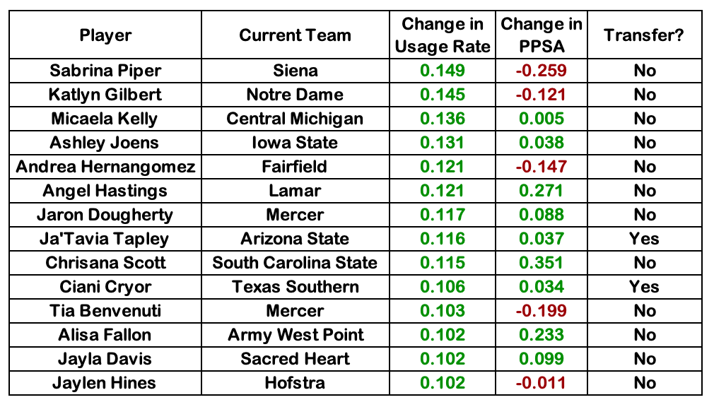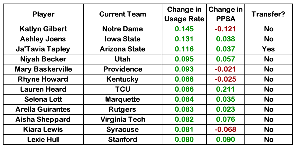 A few other players from top-25 programs just missed the cut, including Missouri State’s Elle Ruffridge (who increased her usage rate by 0.074), UConn’s Olivia Nelson-Ododa (0.074) and Megan Walker (0.072), Tennessee’s Rae Burrell (0.062), Florida State’s Kourtney Weber (0.054), and UCLA’s Lindsey Corsaro (0.053).