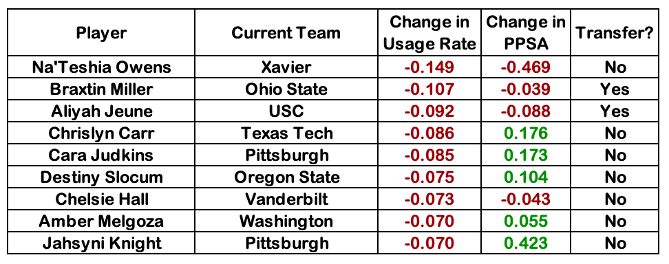Looking only at the power conferences, here are the players whose usage rate has decreased the most this season: