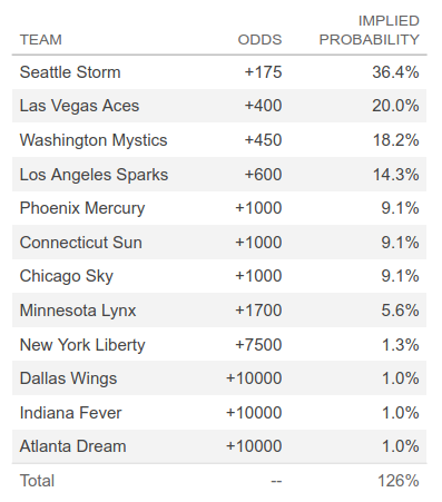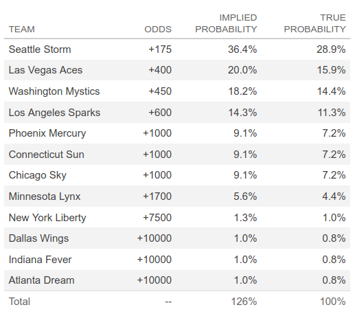 It follows, then, that the true probability of each team winning the championship (according to the book’s model) is a little lower than the implied probability. A team’s true probability can be calculated by dividing its implied probability by the total of the implied probabilities (in this case, 126%). So Vegas believes that its hometown Aces have a true championship probability of 15.9% (20/126). The true probabilities have been added to the table below.