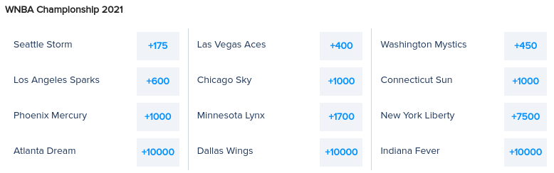 This means that you only want to place a bet if you think a team’s chances are significantly higher than the oddsmakers think they are, not just slightly higher. Phoenix and Connecticut, for example, each have a 7.2% chance to win it in the eyes of FanDuel. However, you won’t be expected to come out ahead by betting on either one of them unless you think one of them actually has over a 9.1% chance to win the championship. If you think the Sun have an 8% chance to win the title, stay away; if you think they have a 15% chance, put your money down.