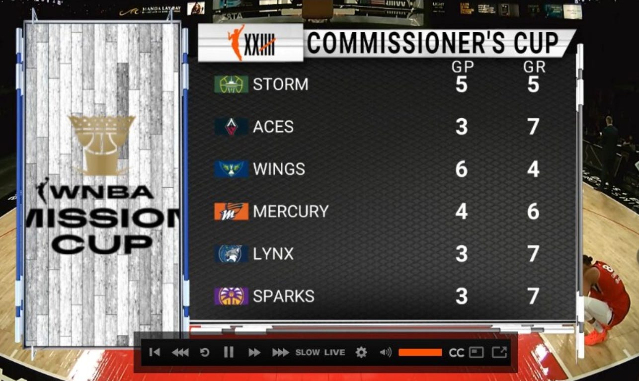 The information is actually wrong, given that they failed to include a Sparks-Lynx game from the previous night, but that's not the highlight. It's a graphic of how many Commissioner's Cup games teams have played, and how many they have left. So the second column, in every case, is obviously 10 minus the first column. What it fails to show in these 'standings', is any indication of how many times the teams have won or lost so far. Great. Helpful. Plus there's still that lovely box on the left where they've plopped the graphic in a box that's completely the wrong shape, so you can just about see that this might be the WNBA's Mission Cup.
