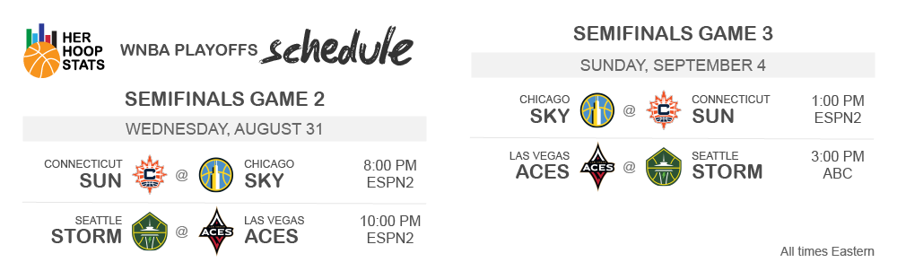Chicago and Connecticut had a fascinating regular-season series and are primed for a blockbuster of a semifinal series. You wouldn’t think so at first glance, as Chicago swept all four meetings. Digging a bit deeper, you’ll notice that all four games were decided by single digits, with the average margin of victory just 4.5 points. That’s the smallest average winning margin between two playoff teams during the regular season this year.
