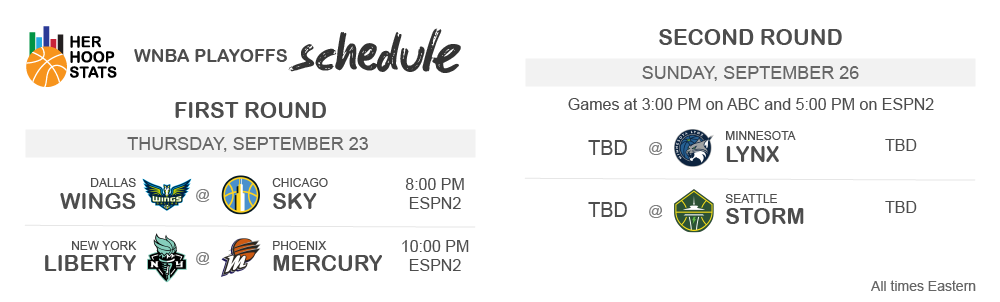 This week, I’ll take another look at Jewell Loyd’s phenomenal performance against Phoenix in a battle for a first-round bye. In particular, I’ll recap her first quarter that had many stat-watchers wondering aloud, “is that a typo?” I’ll also touch on some neat features the Her Hoop Stats team recently released just in time for the playoffs. But first, let’s dive into a topic that will no doubt put smiles on the faces of Connecticut and Las Vegas fans: the importance of the double bye.