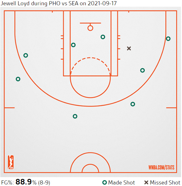 In her previous seven games entering Friday night’s contest versus Phoenix, Seattle guard Jewell Loyd had shot 33.0% from the field and averaged 11.1 points per game. Those are underwhelming figures for someone in the MVP conversation earlier this season. During the pregame show, Storm color commentator Elise Woodward described the importance of Jewell Loyd finding her rhythm before the playoffs: “We’ve seen Jewell Loyd take over games in her career...and it can happen anytime. And especially when she gets hot in the first quarter, you can ride the wave of Jewell Loyd getting buckets.” Friday night was a tsunami of buckets, as the Gold Mamba broke out of her shooting slump in historic fashion during a game her team needed in order to clinch a first-round bye.