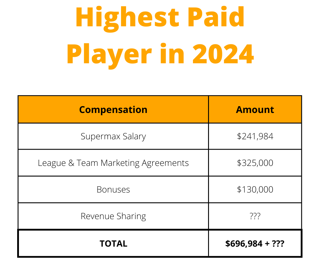 Just how much could a top player make under these circumstances? If we assume the direct payments (which would total $8,488,200) are distributed according to salary, that would mean every player would receive a payment of approximately 48% of their base salary. Below is a list of reasonable compensation estimates for the league’s top player in 2024, based on our example numbers: