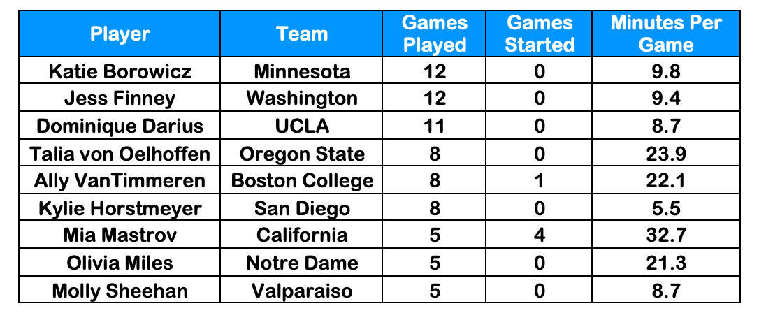 It varied tremendously how soon early enrollees debuted after arriving on campus. On the quicker side, North Dakota’s Erika Lane played just four days after her first practice, and six other players debuted within approximately ten days of joining the team. (Notably, Lane may have had an easier adjustment because her older sister Olivia is a sophomore on the team.) Other players debuted over a month after arriving or were still waiting for their first game minutes as of the end of February.