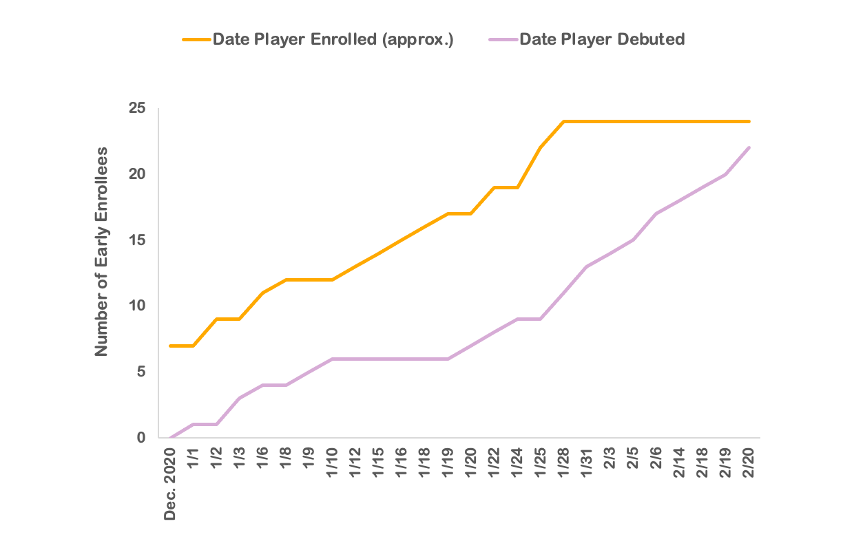 The remaining analyses of the early enrollees’ performance thus far will focus on these nine players, and a leaderboard with selected statistics is available at the end of this article.