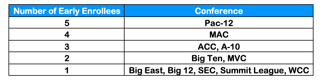 The early enrollees represent 11 different conferences; the Pac-12 has the most with five, followed by the Mid-American Conference with four.