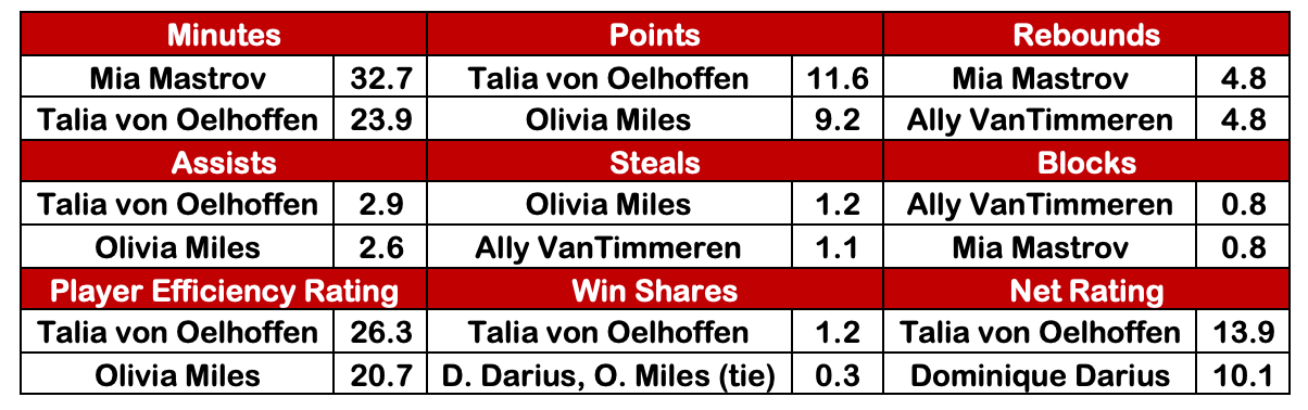 Von Oelhoffen has also led the class in many advanced statistics that measure players’ efficiency and value to their teams, including points per scoring attempt (1.26), player efficiency rating (26.3), and win shares (1.2). Her efficiency is even more impressive when you consider that she has led the early enrollees in usage rate at 25.7%, which means that over a quarter of Oregon State’s possessions with her on the floor have ended with the ball in her hands. It’s difficult to be efficient at that level of usage, especially for a player who has been in college for less than three months.