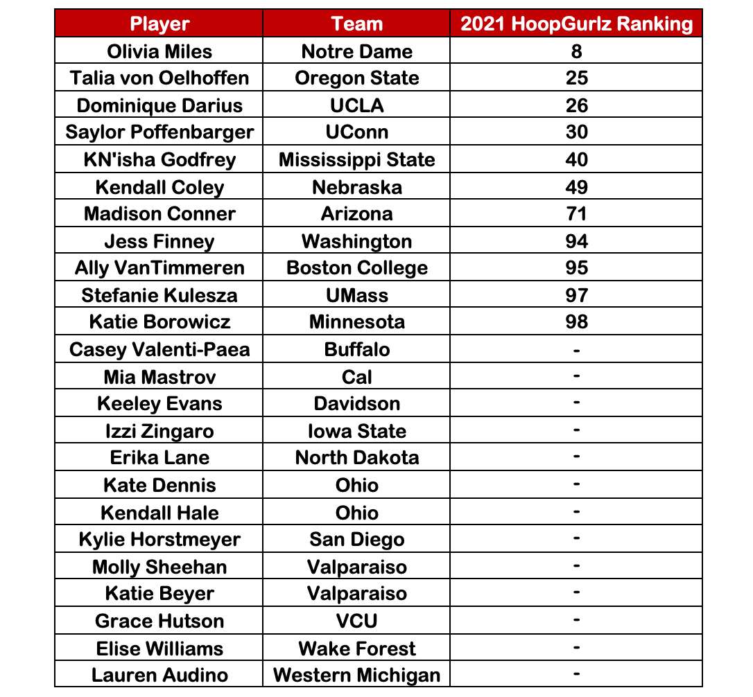 Eleven early enrollees are top-100 recruits in the 2021 class, according to espnW HoopGurlz. Notre Dame’s Olivia Miles is the highest-ranked player at No. 8, and five others rank in the top 50.
