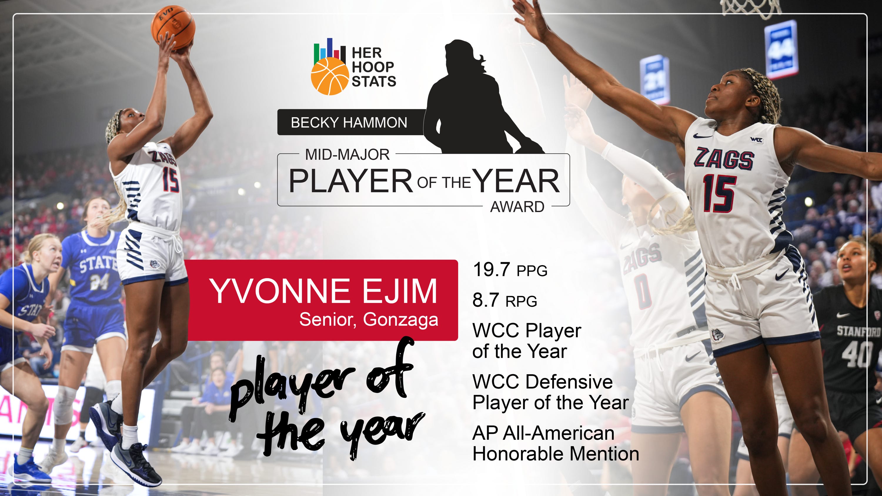 HOPEWELL, N.J. (April 3, 2024) — Her Hoop Stats is proud to announce that Gonzaga senior forward Yvonne Ejim has been named the 2024 Becky Hammon Mid-Major Player of the Year presented by Her Hoop Stats. The award, which is in its fifth season, recognizes the best mid-major player in the country.